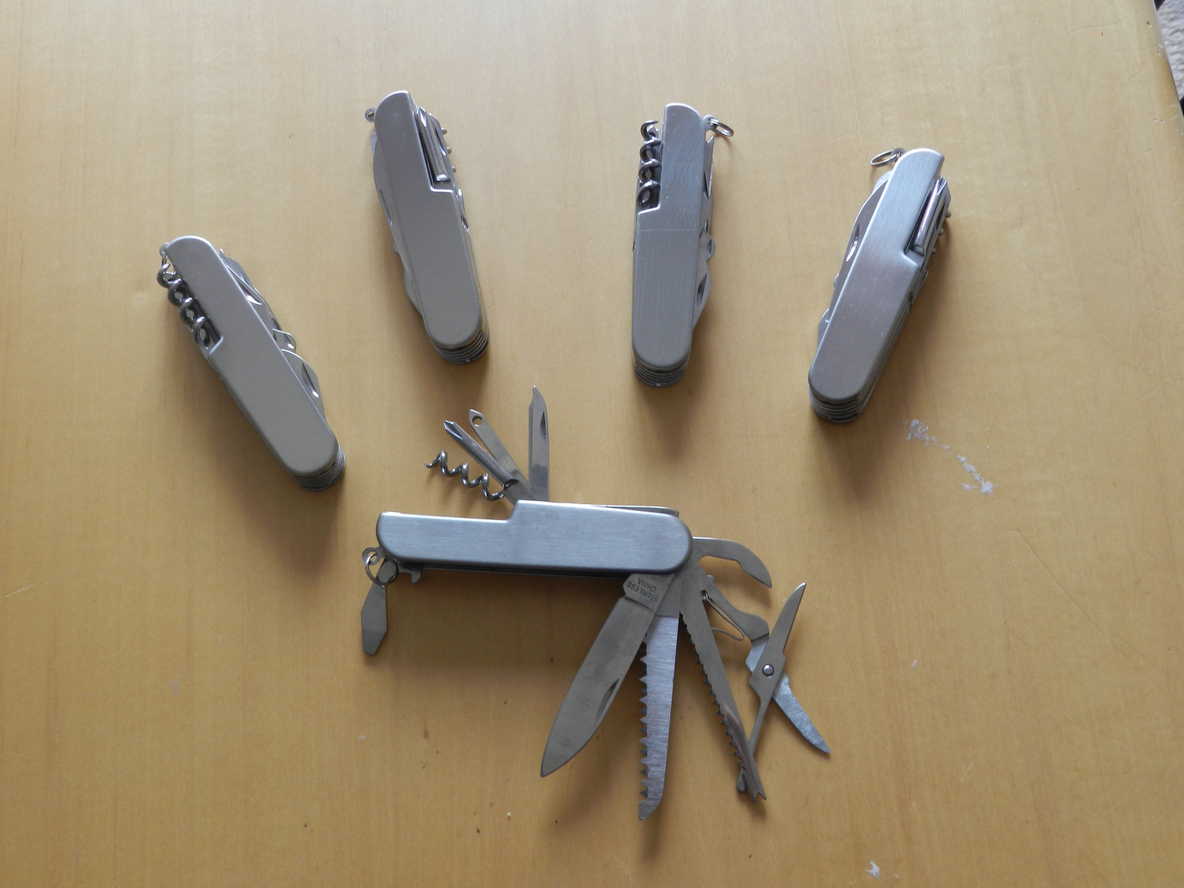 3. 13-tool Pocket Knives - I have 5 of these and actually bought these from the Knot for groomsmen gifts, but ended up getting them something different, and waited too late to return them. Silver-plated, could be easily engraved. Can be attached to a keychain. Selling for $10 each, or $8 each if you buy all 5.