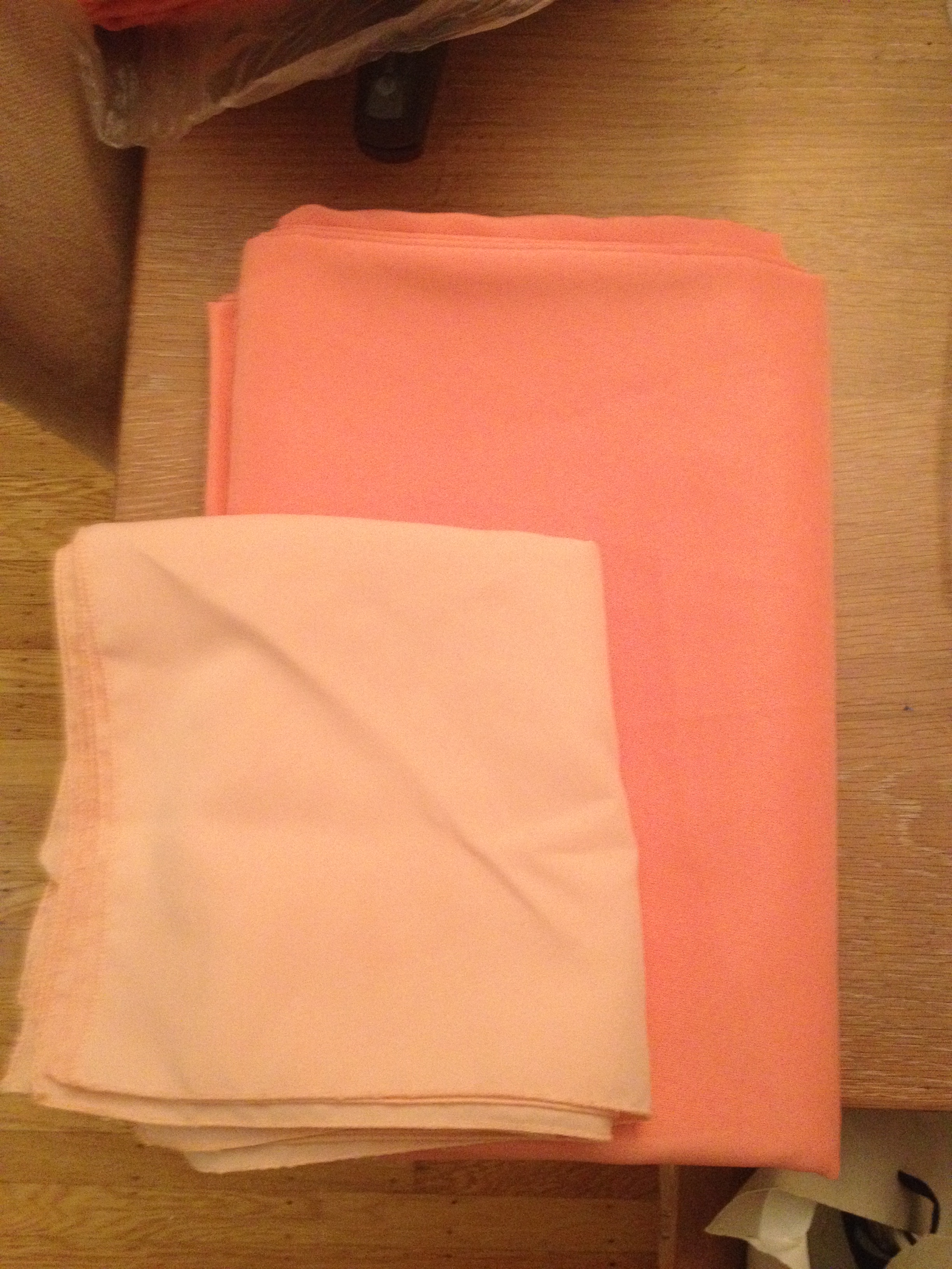 -2 132" round peach/coral poly tablecloths. These are a really pretty color. Bright peach leaning toward coral.