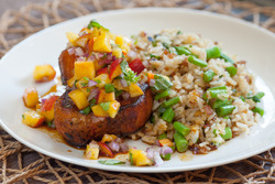 1. Spice-Rubbed Pork Medallions with Peach Salsa & Cilantro Grean Bean Rice