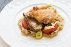 2. Pan Seared Chicken Thighs with Roasted Baby Zebra Eggplants & Fennel Salad