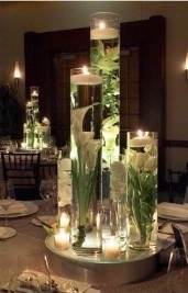- 3 varying heights for submerged centerpieces containing white roses, calla lilies, and either snapdragons or gladiolus. With floating candles on top, gems on bottom, similar to photo.