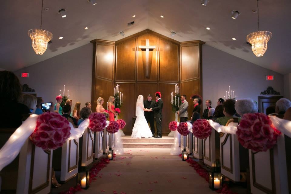• Here's a picture of my wedding day. Our venue had the tool with Christmas lights inside that are draped along the aisle, and the silk petals were theirs as well. We brought the lanterns and what I've been referring to as "flower balls" to the chapel. We also brought the flower petals that the flower girls dropped.
