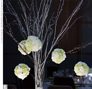 • two large arrangements on either side of the ceremony table that were hydrangeas with 8 ft. curly willow