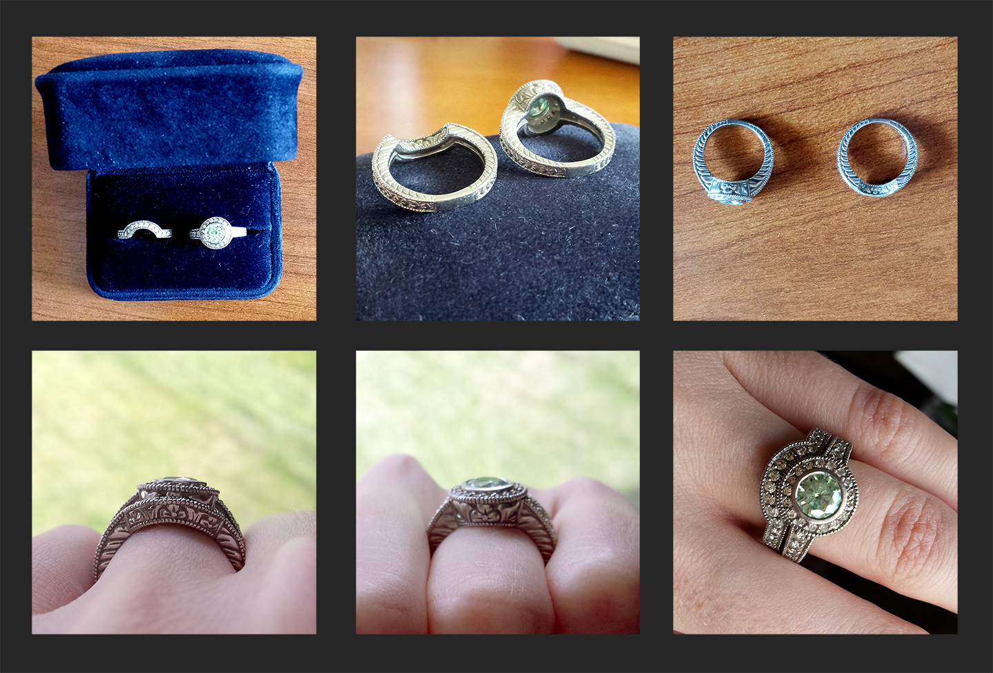 Re: F/S - Wedding Ring Set - Bezel-set, Milgrain, Green Moissanite in Palladium, Size 5.5