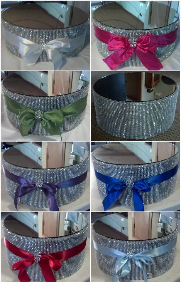 Handmade bling cake stands in white, hot pink, green, purple, royal blue, red, light blue, or plain. They stand 7 inches tall, with a 16 inch mirror, and are a total of 16.5 inches in diameter. $75.00 each, free shipping. I made one for my wedding in June which held our large cake without a problem. They are very sturdy, and reinforced on the inside in the middle with both a top and bottom base as well.