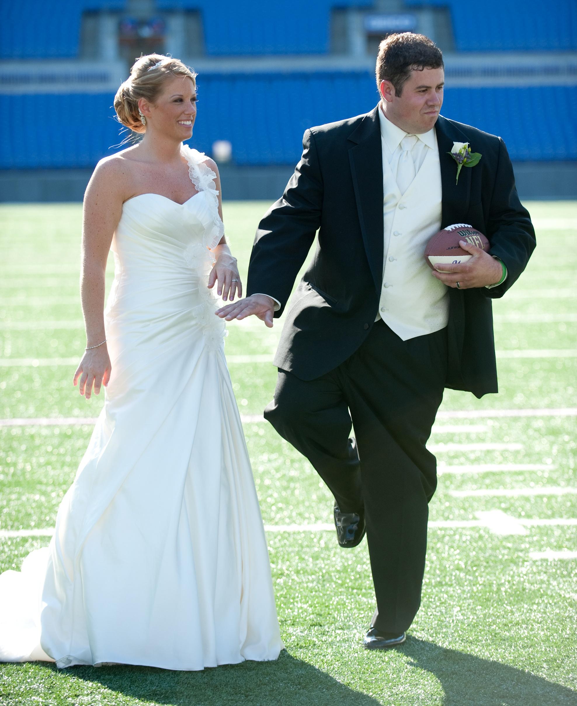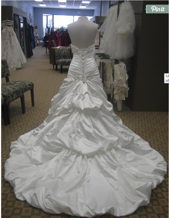My dress may be 3.5 years old and probably considered "dated" now but I still love it and love showing it off.  It was satin with crushed organza flowers all over the train, over the shoulder and down the front.
