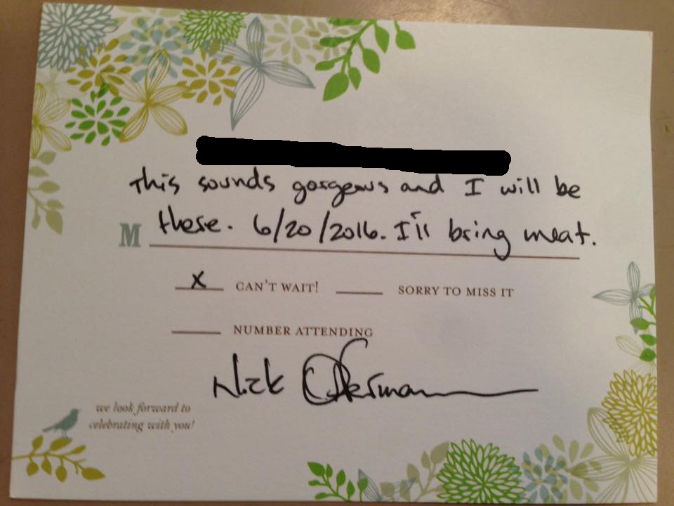 When we sent out invitations for the wedding, we sent one to Nick Offerman, one to Richard Sherman (of the Seattle Seahawks), and one to Bill Murray. Obviously, none of them would actually come to the wedding, but we were just hoping for replies... I had given up, since the wedding was almost a month ago, but lo and behold, today we got Nick Offerman's RSVP back! (The comment about 6/20/16, I am guessing, is a joke because he knows he sent it after the actual wedding.)