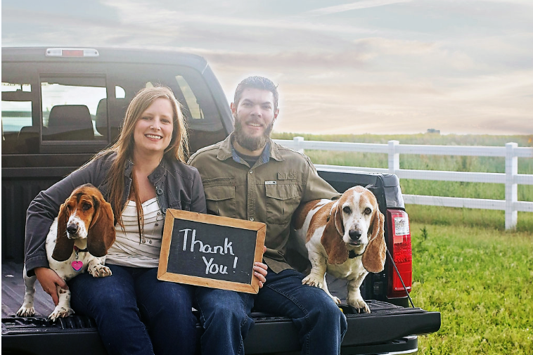 Absolutely this.   The first photo would be lovely without the TY sign but as a thank you picture, I think it needs to be direct.
