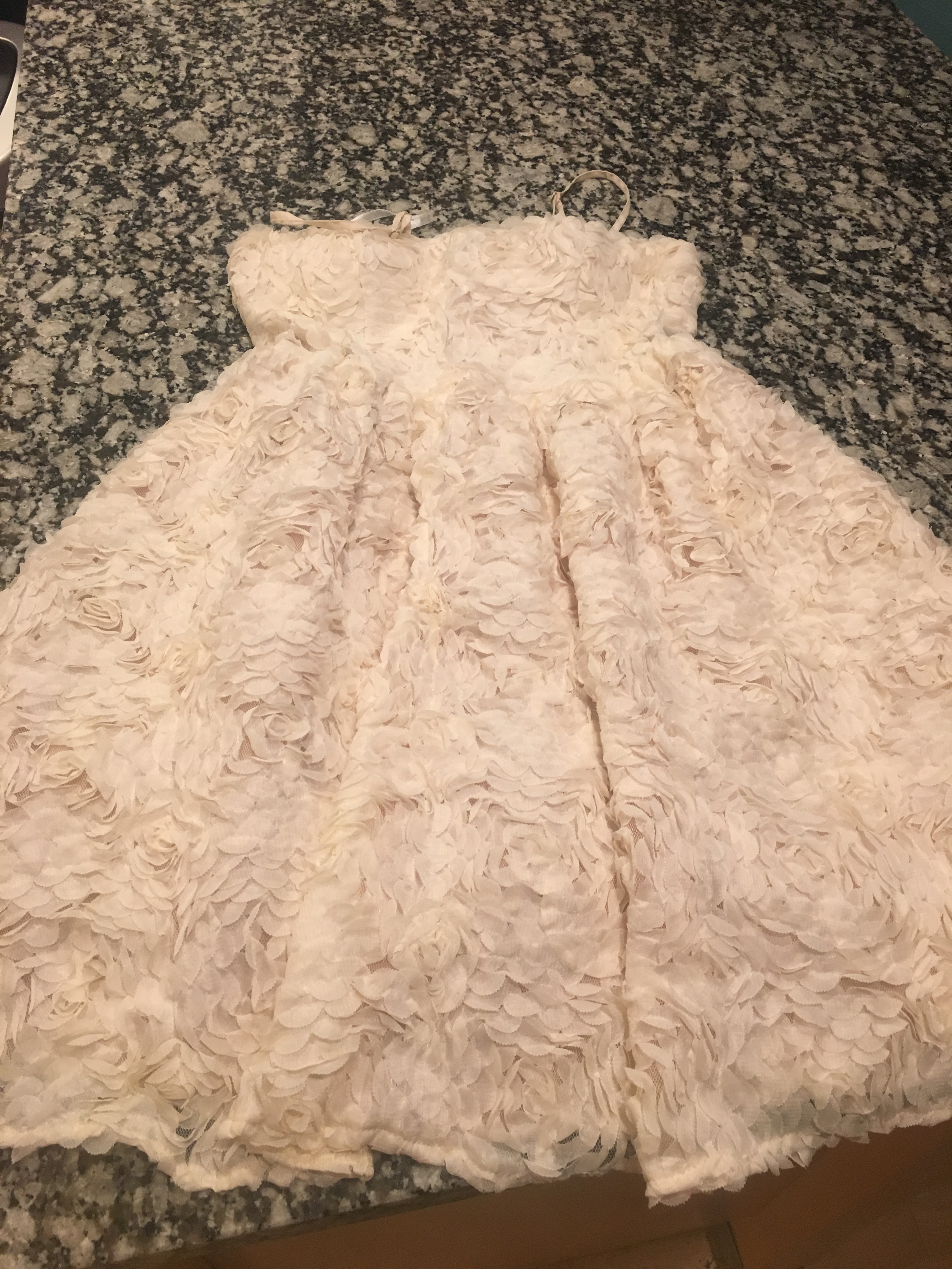 Calling all brides! Looking for the perfect, chic, on trend bridesmaid dresses for your upcoming wedding? I have six brand-new bridesmaid dresses from Adriana papell. They are champagne color, spaghetti straps  and they are floor length. Very flattering with a slightly blouson top. Beautiful beading throughout the entire dress. I have size 2 petite, six regular, 8 regular, eight petite, 10 petite, 12 regular. The difference between petite and regular is the length of the dress.  You can check size charts on Adrianna papels website. These dresses are still in bridal shops and retail for $300 plus per dress! They were bought for my sisters wedding this summer but unfortunately the wedding was called off a month before the ceremony. I also have a junior bridesmaid dress that is about a size 0 To size 4 in juniors. It is a short cream colored dress with rosettes fabric all over it. It flares out like a skater dress and can be either strapless or have spaghetti straps. I have a beautiful beaded ribbon belt in champagne color to match the bridesmaid dresses. Retails 100$ I also have a beautiful off-white lace flower girl dress. It is Bohemian style with a lace top  From moderne child. Retails 40$. Fits size 4-6 in children.  The dresses all have tags on them and the beading is perfect. I hand beaded some of the dresses were there were beads missing and they are 100% perfect Now. I would be willing to sell the bridesmaid dresses for $60 apiece, the junior bridesmaid dress for $40, the belt for 15$ and the flower girl dress for $25. That's a total of 440$ for all + shipping. Will ship anywhere in the USA or Canada and can be payed by PayPal. Let me know! A steal of a deal. Will try to post pictures of the dresses on here too!