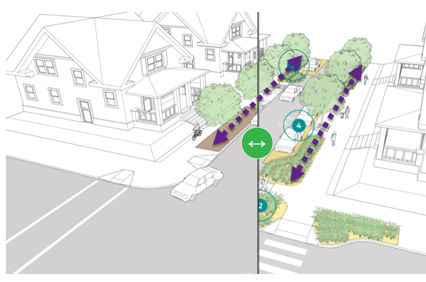 • Here a boulevard is between the sidewalk and the street.  Technically, the city owns it but homeowners are tasked with maintaining it.