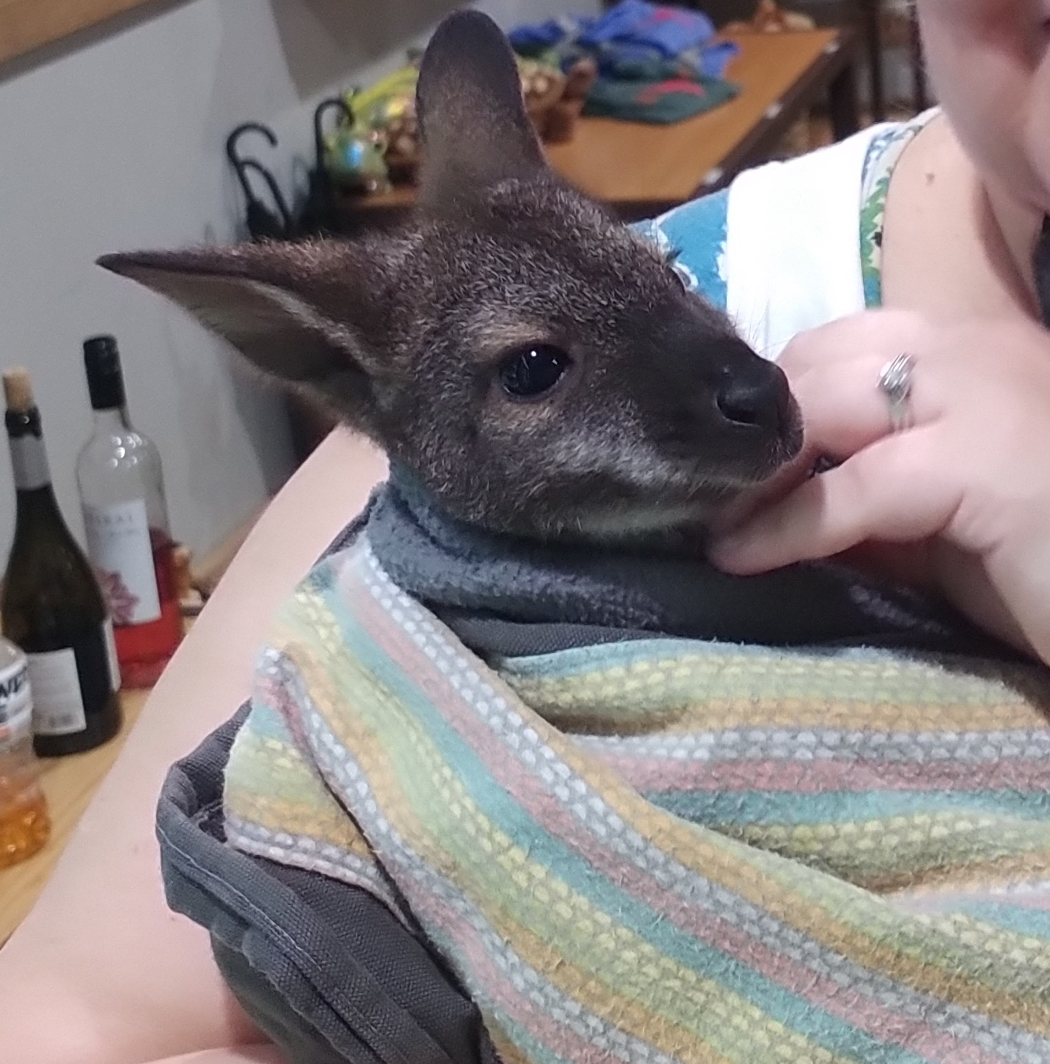 But they saved the best for last.  Totally unexpected!  The gift shop was the entrance/exit.  As we were leaving, one of the staff members was holding a really cute baby animal.  We thought it was a kangaroo, but it was a wallaby.  All wrapped in it's pouch blanket!