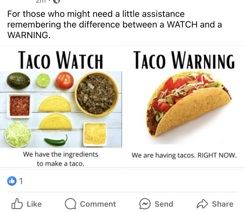 • We’re having some big storms today, and just had a tornado watch (a rarity in our area) and this is  the message our town is putting out on their social media.